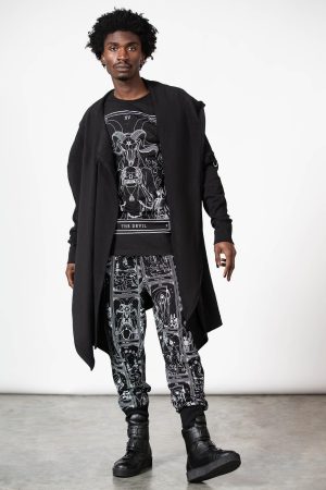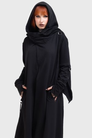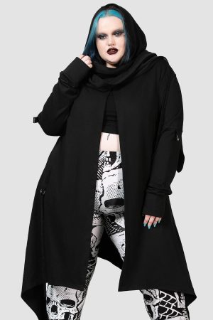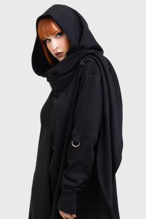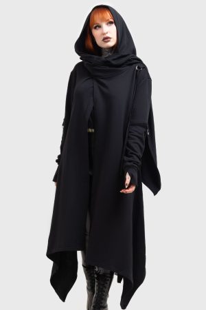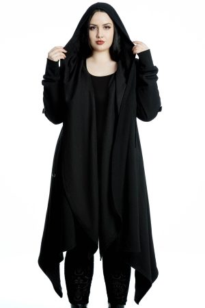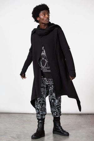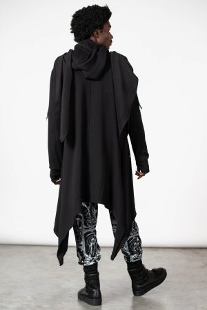 By the grace of the devil we give you this versatile and oh-so[ul]-lustful jersey cardigan; ‘Assassins’ is a dark layering piece with an oversized hood. draping + long length front. uneven hems and D-ring details to sleeves – complete with thumbholes. Yer ready for your midnight calls. dark baptisms or just plain old chill/thrill/kill – a guaranteed head-turner!