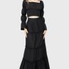 – Long sleeves with elastic detailing down sleeves creating dramatic shaping.