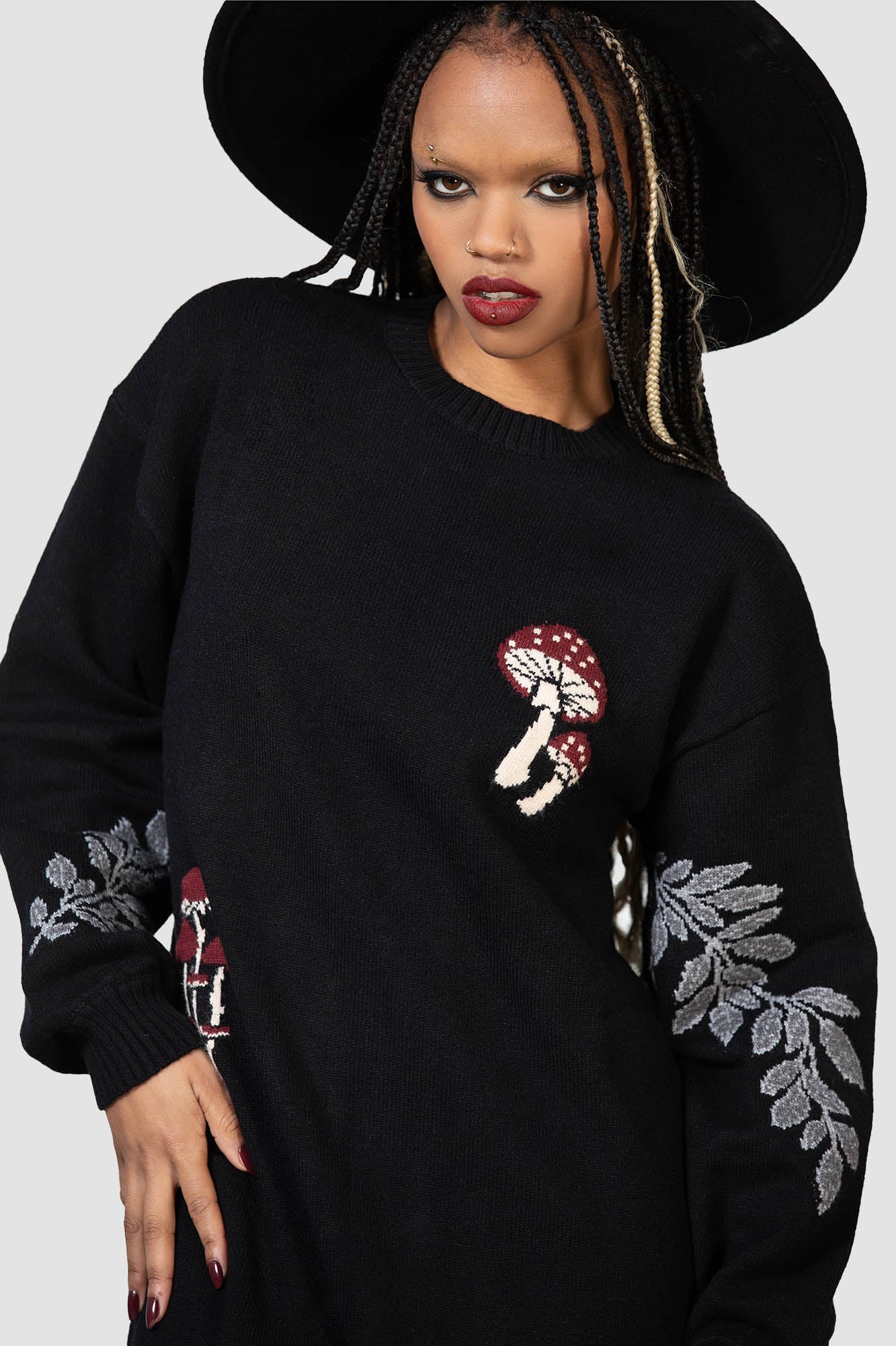 – Statement mushroom and leaf embroidery.