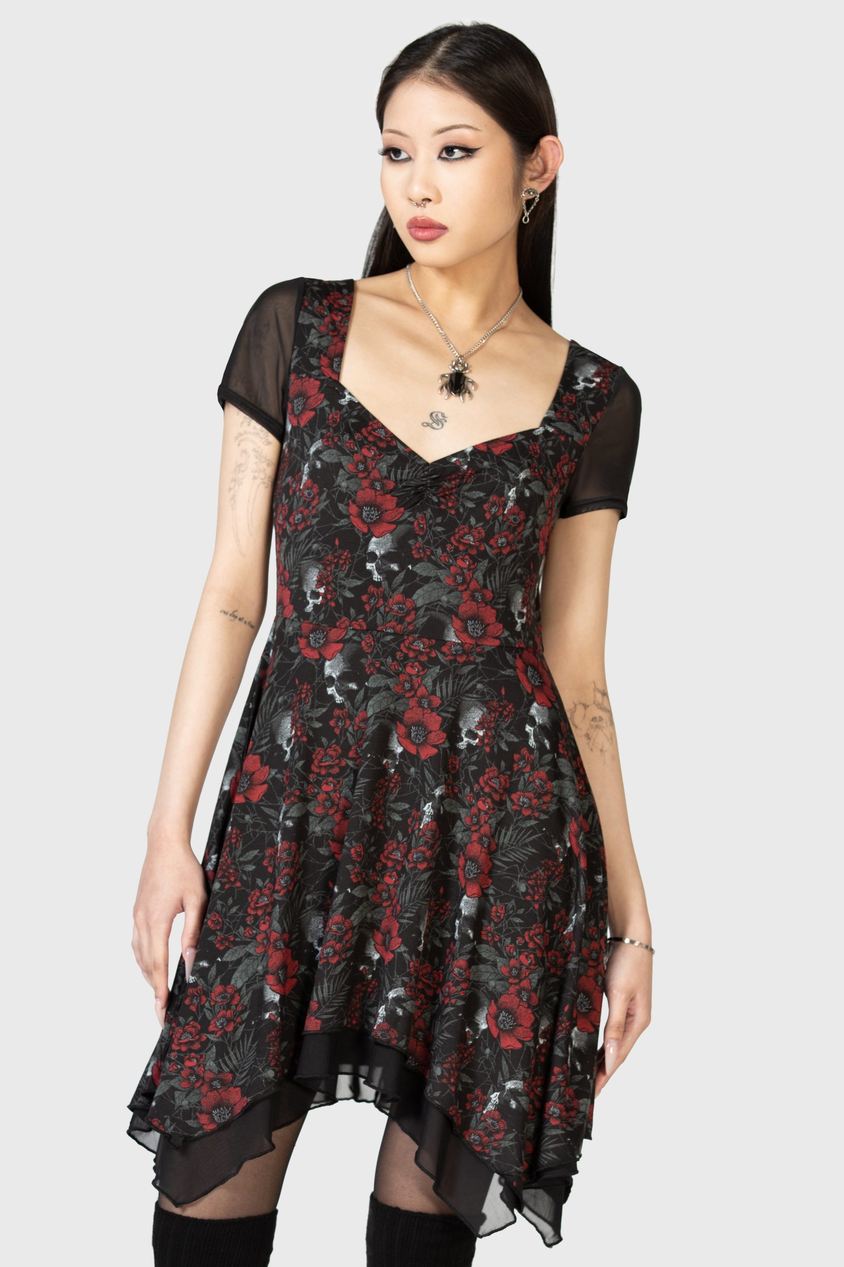 – Statement all over print featuring florals and skulls.