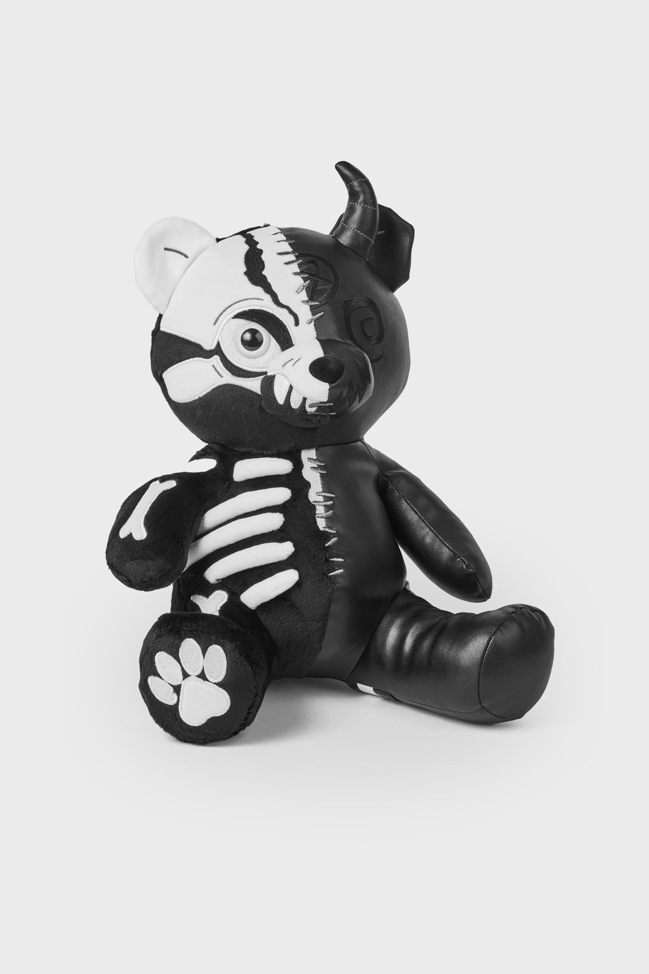 Eat. Sleep. Cuddle. Repeat with our Duplexity: Relic plush. One side soft. with plush skeletal detailing and a contrasting faux leather side featuring a super cute horn and black-on-black embroidered?details. Let your freak flag fly!