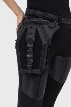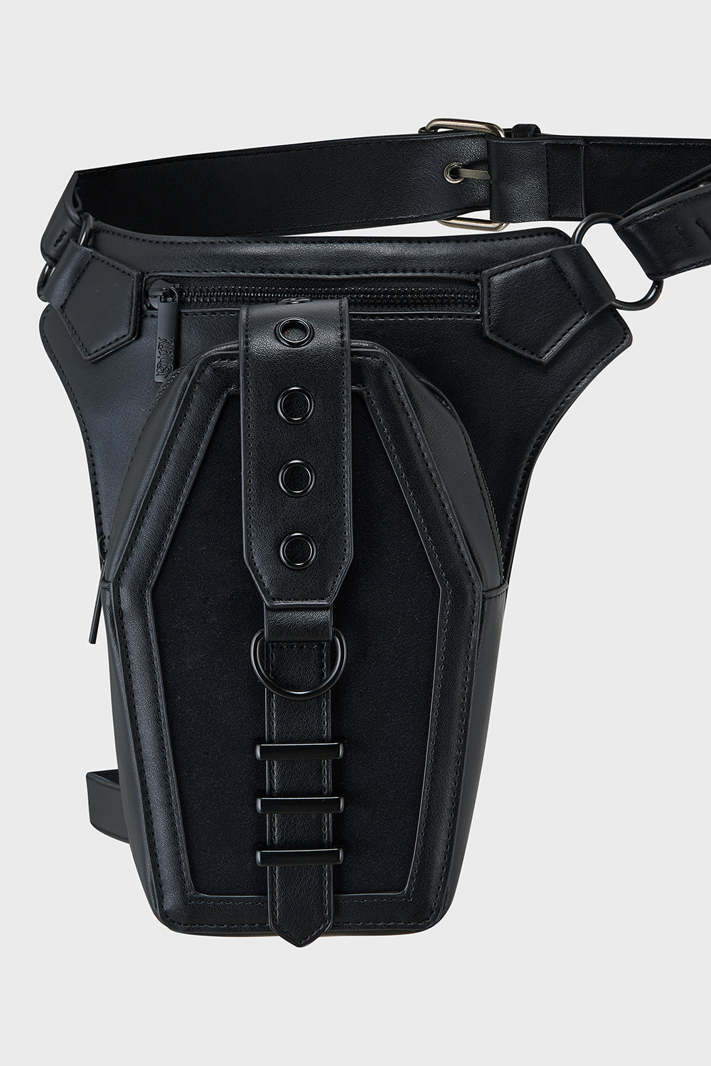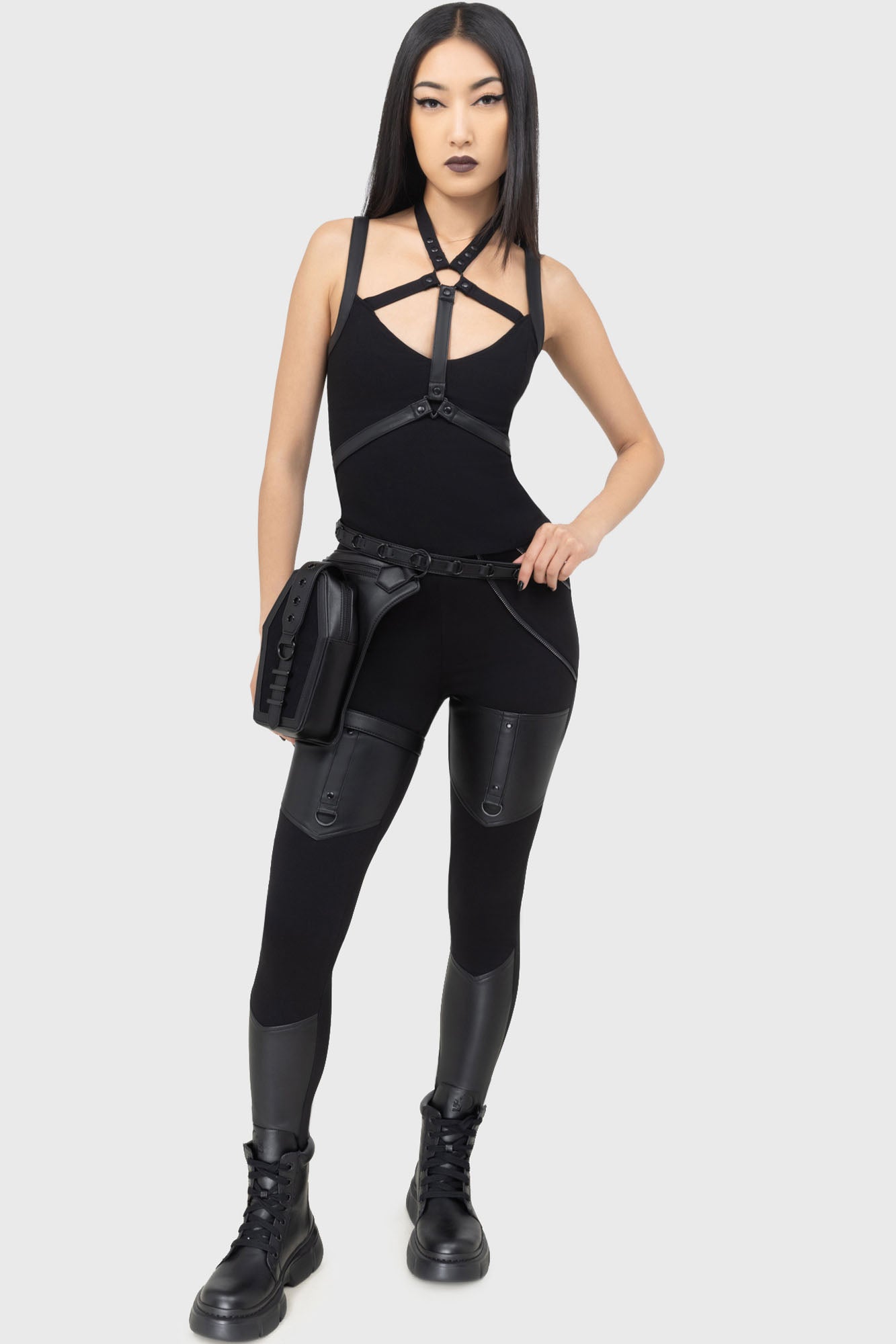 – Waist and thigh strap details with adjustable buckle fastenings.