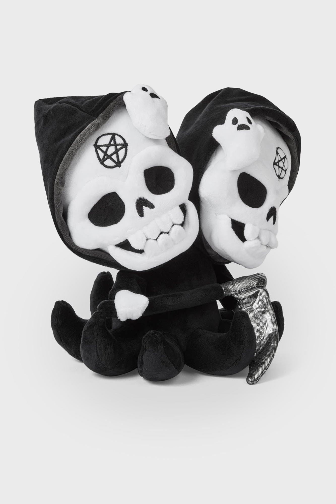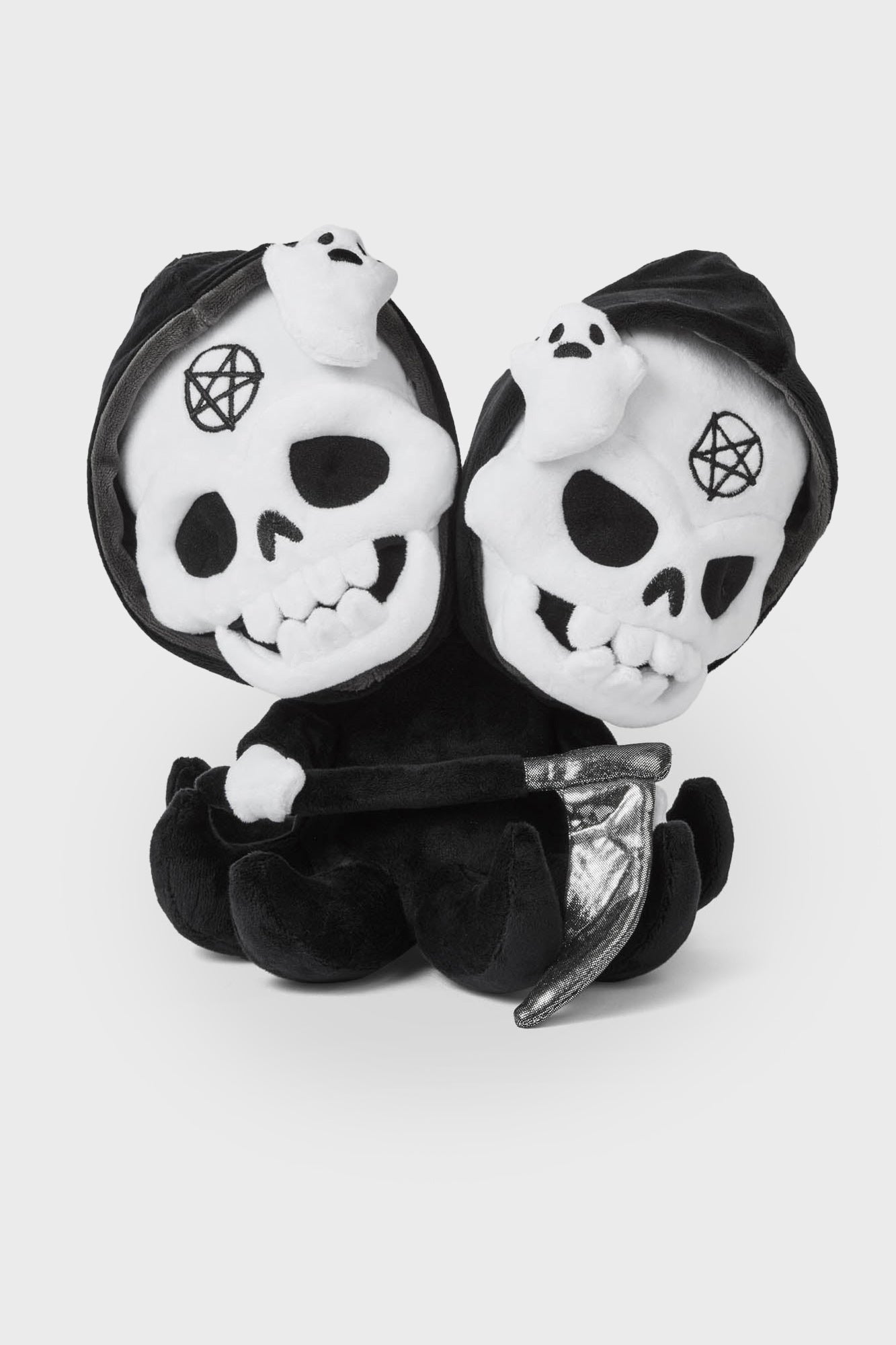 Give yourself a dose of ‘Double death’. This double headed deliverer of death stands at 27.5cm/10.8 of huggable soft plush fur. With embroidered with pentagrams. two friendly little ghosts and a shining scythe. You can trust your deepest. darkest secrets with this cuddly lil’ creature of the dark. Purrfect for gifting – or best of all. for yourself!
