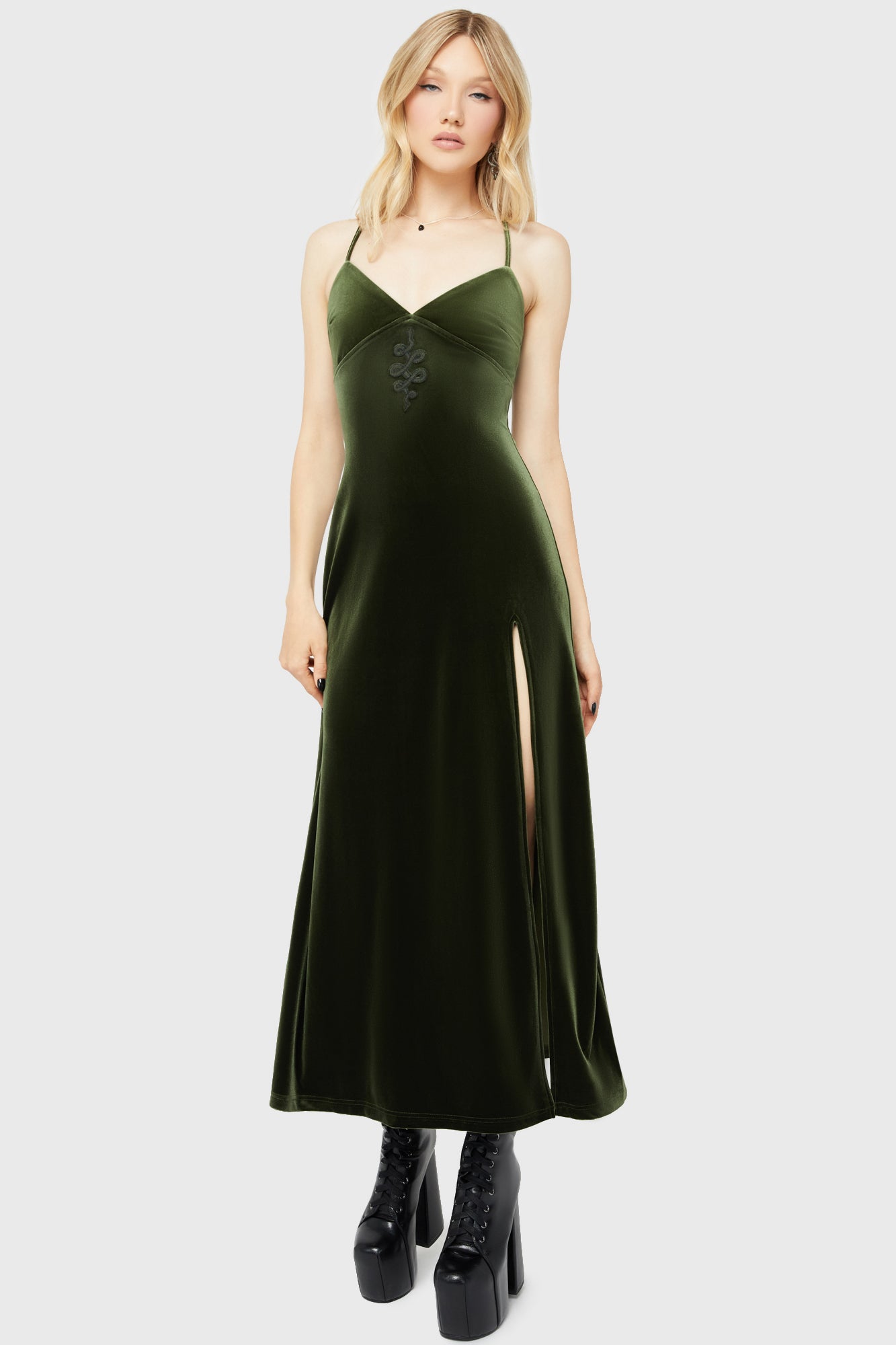 – Unique snake embroidery under the bust.